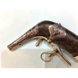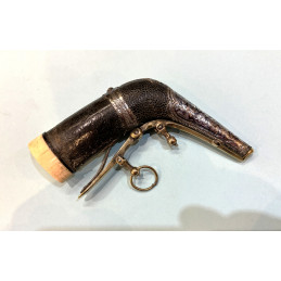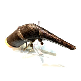 Petite poire à poudre de luxe pour pistolet, en cuivre à décor repoussé d' une tête de guerrier antique casqué, marquée sur chaque face " B. A PARIS" , France milieu du XIXe Siècle. H. 10.5cm.