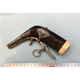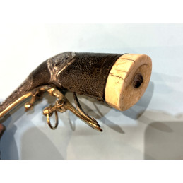 Poire à poudre Française en corne, décorée de trophées militaires en laiton. Début XIXe Siècle, possible Empire Napoléonnien. Rare