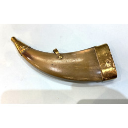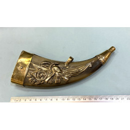 Petite poire à poudre de luxe pour pistolet, en cuivre à décor repoussé d' une tête de guerrier antique casqué, marquée sur chaque face " B. A PARIS" , France milieu du XIXe Siècle. H. 10.5cm.