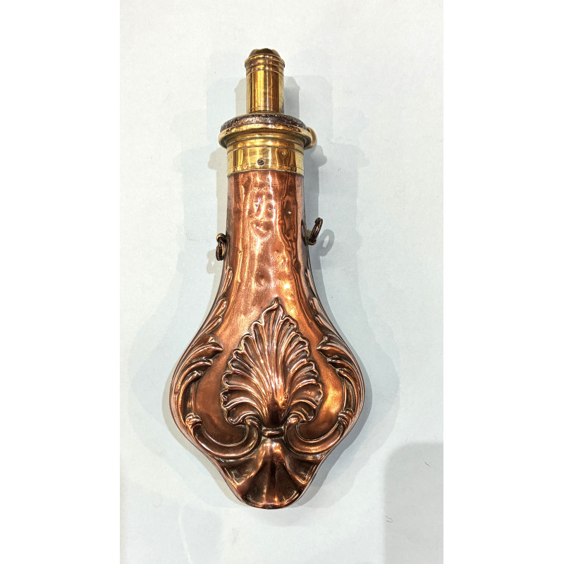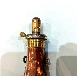 Poire à poudre anglaise, en cuivre, fabrication DRAMS, milieu du XIXe Siècle.